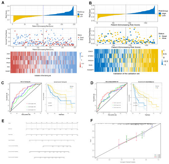 Establishment of model of T-cell prognostic exhaustion. (A) Gene expression in the training set. (B) Gene expression in the validation set. (C) The training set of ROC and Kaplan–Meier survival curves. (D) The validation set of ROC and Kaplan–Meier survival curves. (E) The nomogram of prognostic characteristics. (F) The nomogram calibration curves to predict the 1-, 3-, and 5-year survival rates.