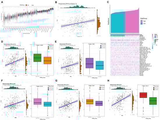 We conducted a detailed investigation of the tumor immune microenvironment associated with TERGs. ssGSEA results indicated that eight types of immune cells were differentiated between the high and low groups of the TERGs: Type 17 T helper cells, natural killer T cells, activated dendritic cells, Type 2 T helper cells, regulatory T cells, activated CD4 T cells, CD56dim natural killer cells, and central memory CD4 T cells. Among these, activated dendritic cells, Type 2 T helper cells, and activated CD4 T cells were particularly significant, followed by regulatory T cells, Type 17 T helper cells, and central memory CD4 T cells (Figure 5A). We observed that the high TERGs group were significantly higher than those of the low group, likely due to the increased immune components in the tumor microenvironment of the high group. This finding suggests that the immune prognosis in the high group is more complex (Figure 5C). Notably, correlation analysis indicated that activated CD4 T cells, Type 17 T helper cells, Type 2 T helper cells, regulatory T cells, and activated dendritic cells all exhibited significant positive correlations with TERGs (Figure S1). Among these, regulatory T cells showed particularly strong significance. In Figure 5B, we observed a significant positive correlation between TERGs and Tregs, with an increased infiltration of Tregs in the High group. This suggests that TERGs contribute to a tumor-suppressive microenvironment.