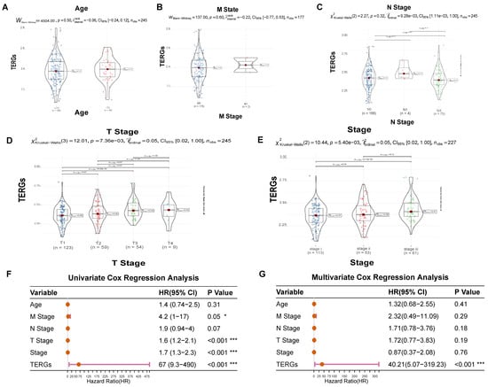 We further investigated the relationship between clinical features and exhaustion score (Figure 6A–E). Age, M stage, and N stage do not exhibit statistically significant differences in exhaustion scores, suggesting that there is no direct correlation between these factors and the degree of exhaustion (Figure 6A–C). However, within the TNM tumor staging system, significant statistical differences were observed among T stages, indicating a correlation between exhaustion scores and T stages (Figure 6D). The overall stage reflects the extent of lymph node involvement and metastasis. Notably, as TERGs increase, the severity of Stage I, Stage II, and Stage III also escalates (Figure 6E). Higher exhaustion scores are linked to larger primary tumors, increased invasion of surrounding tissues, greater overall damage, and a poorer prognosis.