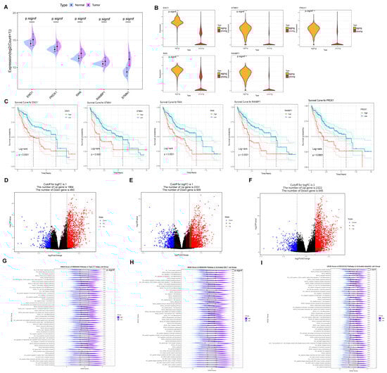 Subsequently, we investigated the expression, survival, pathway enrichment, and activity of these five prognostic genes. Firstly, ENO1 expression was elevated in the tumor group (Figure 7A) and significantly higher in aging T cells compared to the young group (Figure 7B). Furthermore, high ENO1 expression in the Kaplan–Meier survival curves predicted a poorer prognosis (Figure 7C). ENO1 has been found to be overexpressed in a variety of cancers and is associated with tumor cell proliferation and metastasis [,]. Moreover, elevated STMN1 expression in both the tumor and senescent groups (Figure 7A,B) indicates worse outcomes in the Kaplan–Meier survival curves compared to the low expression group, suggesting a poor prognosis (Figure 7C). STMN1 is involved in tumorigenesis and tumor progression, with abnormal overexpression linked to aggressive tumor growth and poor prognosis []. Additionally, a similar trend was observed for PRDX1, RANBP1, and RAN genes.