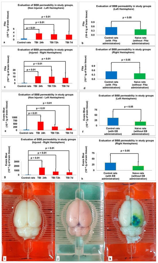 Illustrated assessment of BBB disruption in the study groups using a histological method. (a) FNa extravasation between control rats and rats after TBI at 24 h, 72 h, and 7 d in the non-injured left hemisphere. (b) FNa extravasation between control rats and naïve rats in the left hemisphere. (c) FNa extravasation between control rats and rats after TBI at 24 h, 72 h, and 7 d in the injured right hemisphere. (d) FNa extravasation between control rats and naïve rats in the right hemisphere. (e) Evans Blue extravasation between control rats and rats after TBI at 24 h, 72 h, and 7 d in the non-injured left hemisphere. (f) Evans Blue extravasation between control rats and naïve rats in the left hemisphere. (g) Evans Blue extravasation between control rats and rats after TBI at 24 h, 72 h, and 7 d in the injured right hemisphere. (h) Evans Blue extravasation between control rats and naïve rats in the right hemisphere. (i) Representative histological image of a naive rat. (j) Representative histological image of a control rat. (k) Representative histological image of a TBI rat.