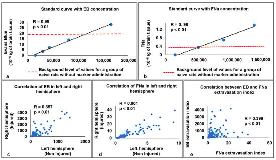 Standard curve for EB and FNa and correlation between permeability markers measurements in the study groups. (a) Standard curve of EB with concentrations in well from 0 × 10−6/g of brain tissue to 28 × 10−6/g brain tissue, equivalent to the content in brain tissue. (b) Standard curve of FNa with concentrations in well from 0 × 10−6/g of brain tissue to 3.5 × 10−6/g brain tissue, equivalent to the content in brain tissue. The red line shows the autofluorescence level of values in brain tissue in the naive group without marker administration. (c) Correlation between the results of the EB extravasation index when comparing the left and right hemispheres in the study groups. (d) Correlation between the results of the FNa extravasation index when comparing the left and right hemispheres in the study groups. (e) Correlation between the results of the EB extravasation index and the FNA extravasation index in the study groups.