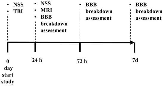 Experimental timeline. BBB—blood–brain barrier; MRI—magnetic resonance imaging; NSS—neurological severity score. TBI—traumatic brain injury.