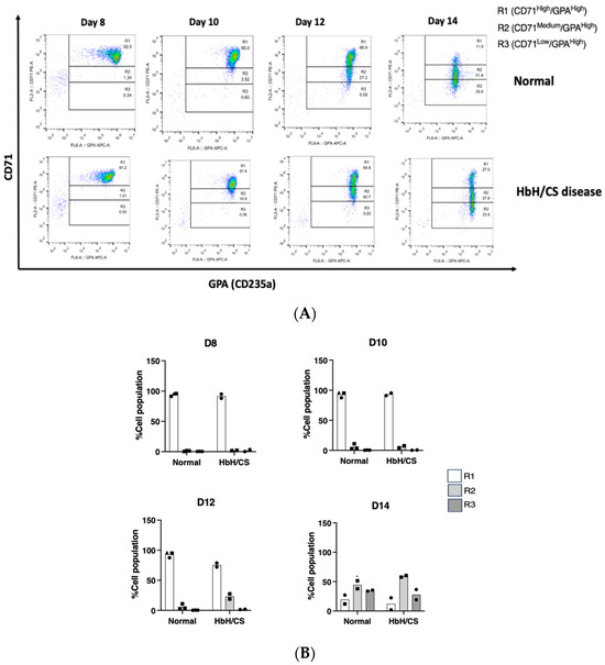 To evaluate the progress of erythroid differentiation, we examined erythroid cells on days 8, 10, 12, and 14 of culture. The cells were stained with antibodies targeting erythroid surface markers for this assessment. Specifically, we used phycoerythrin (PE)-conjugated anti-human CD71 antibody (clone CY1G4; Biolegend, San Diego, CA, USA) and allophycocyanin (APC)-conjugated anti-human CD235a (Glycophorin A, GPA) antibody (clone HIR2; Biolegend, San Diego, CA, USA). Gating strategies based on the expression of CD71 and GPA markers were employed to distinguish between different stages of erythroblast development. Specifically, R1 (CD71High/GPAHigh) represented basophilic erythroblasts, R2 (CD71Medium/GPAHigh) represented polychromatic erythroblasts, and R3 (CD71Low/GPAHigh) represented orthochromatic erythroblasts and nucleated erythroid cells. Data analysis was conducted using the FlowJo version 10.3.0 (FlowJo LLC, Ashland, OR, USA) software.