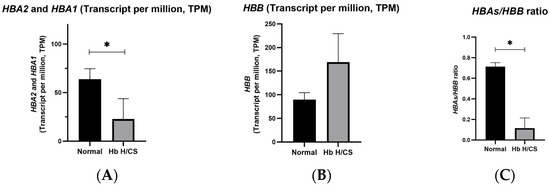 The expression of the genes of interest, HBAs and HBB, was represented using transcripts per million (TPM) values. (A) HBA2 and HBA1 mRNA expression in erythroid cells derived from normal controls (N = 3) and patients with hemoglobin H/Constant Spring (Hb H/CS) disease (N = 6) showed a significant difference (p-value = 0.0216). (B) The mRNA expression of HBB between normal controls and patients with Hb H/CS disease did not show a significant difference (p-value = 0.0735). (C) The HBAs/HBB ratio between normal controls and patients with Hb H/CS disease showed a significant difference (p-value < 0.0001). Statistical significance was determined using t-tests, with a p-value of <0.05 considered significant. * p < 0.05 when compared with normal controls.