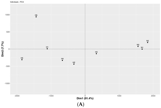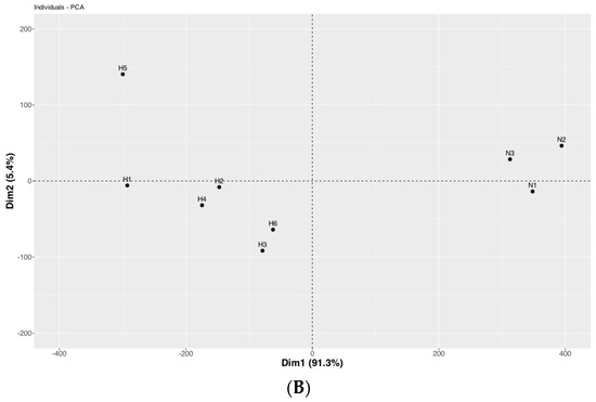 The Principal Component Analysis (PCA) gene expression datasets. N1–N3 represent normal controls and H1–H6 represent patients with hemoglobin H/CS disease. (A) The PCA of nine heat shock protein (HSP) gene expression datasets and (B) the PCA of nine chaperonins containing TCP-1 complex (CCT) gene expression datasets.