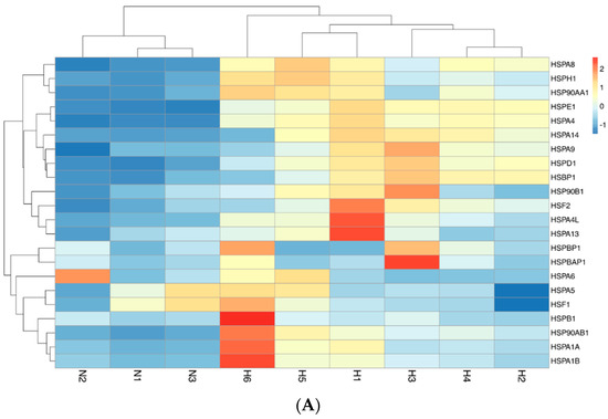 Additional gene expression pattern analysis supported the findings from the PCA. Figure 5A shows all normal samples clustered together, displaying lower expressions of HSP genes, with exceptions being relatively higher expressions of HSPA6 in one control and elevated expressions of HSPA5 and HSF1 in two controls. Samples from the Hb H/CS disease group formed a distinct cluster. Notably, one Hb H/CS disease sample was placed in a unique clade, showing upregulation of HSPB1, HSPA1A, HSPA1B, HSP90AB1, and HSF1.
