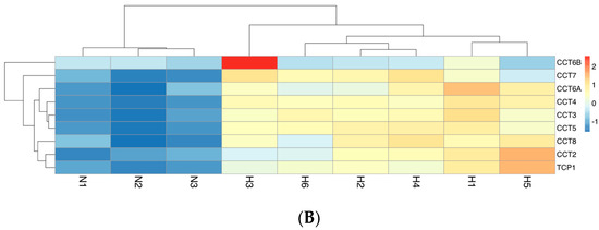 A heatmap of the gene expression. N1–N3 represents normal controls and H1–H6 represents patients with hemoglobin H/CS disease. A heatmap of the 22 heat shock protein (HSP) gene expression (A) and nine chaperonins containing TCP-1 complex (CCT) gene expression (B).