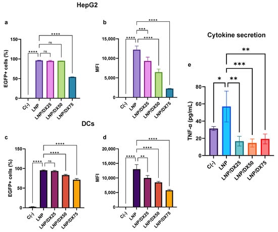 Transfection efficiency of the LNP/DX formulations in HepG2 cells (a,b) and mouse dendritic cells DC 2.4 (c,d) with a total mRNA of 1 µg/mL for 24 h. Stimulation with LNP and cytokines secretion by DCs was also determined (e). Results represent the mean (n = 3) ± SD. Abbreviations: C−: untreated cells. One-way ANOVA followed by Fisher’s LSD test was used to compare between groups: p < 0.05 (*), p < 0.01 (**), p < 0.001 (***), p < 0.0001 (****), and ns (not significant; p > 0.05).