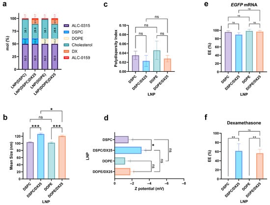 Screening of DX concentrations into LNPs with NanoAssemblr® Ignite™. Composition of the different formulation with DSPC or DOPE helper lipids (a). The mean size (b), PDI (c), and Z potential (d) of the LNPs were determined. The encapsulation efficiency of the reporter EGFP mRNA (e) and DX (f) was calculated. The results represent the mean (n = 3) ± SD. One-way ANOVA followed by Fisher’s LSD test was used to compare between groups: p < 0.05 (*), p < 0.01 (**), p < 0.001 (***), and ns (not significant; p > 0.05).
