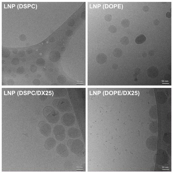 Cryo-TEM images of LNPs composed of DSPC, DOPE, DSPC/DX25, and DOPE/DX25.