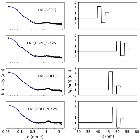 SAXS profiles of the different LNP and LNP/DX formulations. The left column shows the Loglog plot of the experimental SAXS pattern in (symbol) and the fitted curve in continuous line. The right column shows the electron density profile obtained from the bilayer model in function of the radius of the particle. The density distribution is affected by the particle surface composition.
