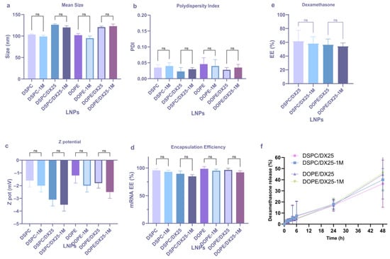 Stable LNPs were obtained with sizes around 100 nm for LNP and approximately 120 nm for DX-loaded LNPs (Figure 3b). The LNPs demonstrated high homogeneity indices, with PDI values below 0.05 (Figure 3c). The Zeta potential of all formulations remained close to neutrality, ranging from −1 to −3 mV (Figure 3d). The encapsulation efficiency (EE) of mRNA was around 90% for all formulations, indicating that DX did not affect the EE (Figure 3e). In addition, approximately 60% of DX was successfully encapsulated in both formulations (Figure 3f). At this point, no significant differences were observed (p > 0.05) in the studied physicochemical properties of LNPs by replacing DSPC with DOPE.