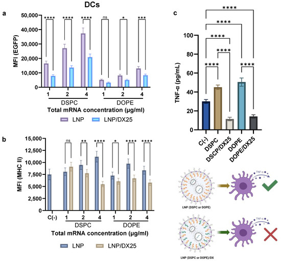 mRNA transfection (a) and MHC II expression (b) in dendritic cells (DC2.4) after incubation with LNPs and DX/LNPs at increasing concentrations of mRNA (1, 2, and 4 µg/mL of total mRNA) for 24 h. Mean fluorescence intensity (MFI) was analyzed by FACS. TNF-α cytokine release was also determined for all LNP formulations, suggesting that DX-loaded LNPs did not induce cytokine release, as depicted in the scheme (c). Results represent the mean (n = 3) ± SD. One-way ANOVA followed by Fisher’s LSD test was used to compare between groups: p < 0.05 (*), p < 0.01 (**), p < 0.001 (***), p < 0.0001 (****), and ns (not significant; p > 0.05).