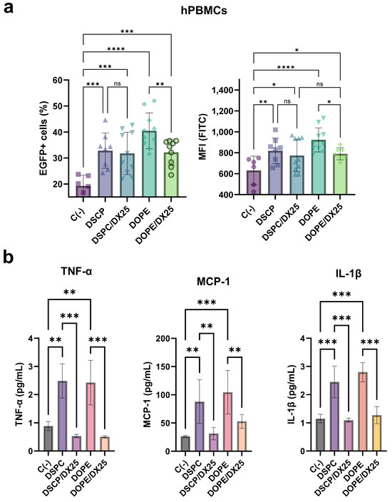 hPBMCs are a diverse mixture of immune cells, making them a relevant target cell population to evaluate the immunosuppressive effects of LNP-formulated DX. Analysis with mRNA-encoded EGFP showed that all formulations were able to transfect cells in the range of 30% to 40% (Figure 9a). There was no significant difference between LNP(DSPC) and LNP/DX(DSPC) in the percentage of transfected cells and mean EGFP expression per cell. In the case of LNP(DOPE), the incorporation of DX into LNP resulted in a slight decrease in transfection efficiency, but still with expression levels comparable to LNP/DX(DSPC). EGFP expression was statistically significant (p < 0.05) compared to the negative control.