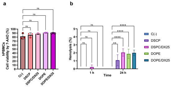 Biocompatibility of DX-loaded LNPs. The cell viability of hPBMCs was determined by incorporation of the 7-AAD with flow cytometry (a). The hemotoxicity of the different LNP formulations was also assessed (b). The results represent the mean (n = 3) ± SD. One-way ANOVA followed by Fisher’s LSD test was used to compare among groups: p < 0.01 (**), p < 0.0001 (****), and ns (not significant; p > 0.05).
