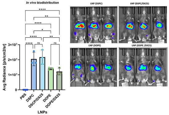 The in vivo biodistribution of DX-loaded LNPs in a C57BL/6 naïve mice was assessed. The mice were intramuscularly injected with Luc mRNA-LNP at a dose of 7.0 µg per mouse. After 6 h, bioluminescence throughout the body was quantified (Figure 11). All LNP and DX-loaded LNP formulations exhibited Luc expression. There were no significant differences in Luc expression between the LNP and DX-loaded LNP formulations (p > 0.05), suggesting that DX does not affect in vivo expression. While the DSPC formulation exhibited an average radiance of approximately 2 × 107, the DOPE formulations showed bioluminescence values that were 2-fold lower (p < 0.05).