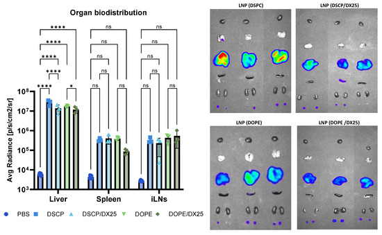 Regarding organ biodistribution, ex vivo imaging was also performed (Figure 12). The imaging of various tissues revealed the strongest signal in the liver. Although a lower Luc expression on the order of 5 × 105 luminescent units was observed in the spleen and inguinal lymph nodes of mice treated with both LNP and DX-loaded LNPs, these values were not significantly different compared to liver values, which were nearly 100 times higher. These results suggest that almost all the DX-loaded LNPs target liver tissues, making them a promising tool for expressing target proteins and potentially reducing inflammatory effects associated with liver-related pathologies. The change in lipid composition from DSPC to DOPE did not appear to affect the final biodistribution of the DX-LNPs following intramuscular administration.