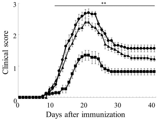 HGF can ameliorate MOG35–55-induced EAE. The progression of MOG35–55-induced EAE (EAE) was monitored daily and scored on disease severity on a clinical scale from 0 to 5, as described in the text. EAE symptoms in HGF-Tg+/+ mice (closed square, n = 24) were significantly milder than those in WT (closed circle, n = 23) and HGF-Tg+/− mice (closed triangle, n = 23). The mean clinical score (±SEM) is shown. ** p < 0.01 is shown (vs. WT).