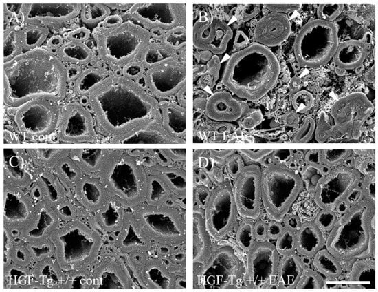 We have previously established the powerful technique of osmium-maceration SEM to observe morphological changes of myelin during demyelination [6,20,21]. This method enables us to observe abnormal myelin morphologies from the initial step of demyelination (detachment of myelin with compact lamination from the axon) to the formation of multiple and obstructive myelin [6,20,21]. In the white matter of the lumbar spinal cord in naïve mice, myelin morphology was no different between WT and HGF-Tg+/+ mice (Figure 2A,C). While various types of abnormal myelin morphologies were observed in the white matter of the EAE spinal cord in the WT mice (Figure 2B, arrowheads), HGF-Tg+/+ mice inhibited EAE-induced abnormal myelin formation at the initial step of demyelination, suggesting a nearly normal morphology (Figure 2D).