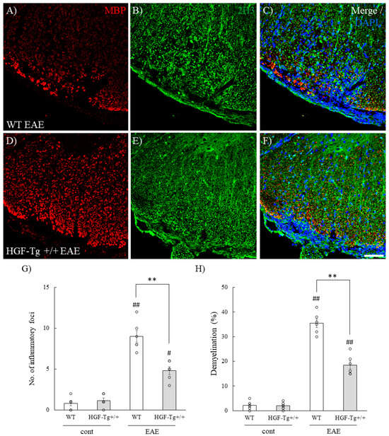 Suppression of EAE-induced demyelination and axonal injury in HGF-Tg+/+ mice. Frozen cross-sections of the lumbar spinal cords from either WT (A–C) or HGF-Tg+/+ mice (D–F) taken on day 20 post-immunization (peak disease) were stained with DAPI (blue, C,F), anti-MBP antibody (red, A,D,C,F), or anti-2H3 antibody (green, B,E,C,F). Representative data are shown. In panel (A), the intensity of MBP reactivity was decreased, indicating demyelination. Quantitative analysis (n = 5). The number of inflammatory foci (G) and % demyelination (H). Scale bars: 20 μm (A–F). # p < 0.05, ## p < 0.01 (vs. naïve), ** p < 0.01 (vs. WT).