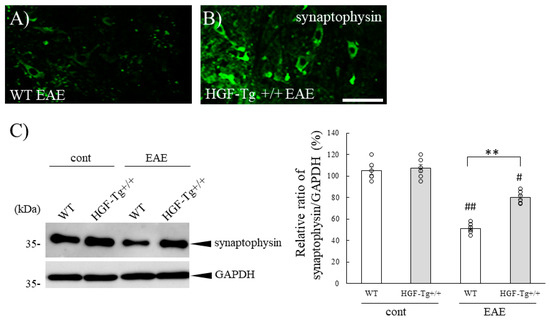The expression level of synaptophysin is maintained in the EAE lumbar spinal cord of HGF-Tg+/+ mice but not in WT mice. Frozen cross-sections of the lumbar spinal cords from either WT (A) or HGF-Tg+/+ mice (B) taken on day 20 post-immunization (peak disease) were stained with anti-synaptophysin antibody (green). (C) Immunoblot analysis showing expression of synaptophysin in the lumbar spinal cords from naïve and EAE mice. GAPDH was used as a loading control. Representative data are shown (n = 5). The ratio of synaptophysin/GAPDH is shown. Scale bars: 50 μm. # p < 0.05, ## p < 0.01 (vs. naïve), ** p < 0.01 (vs. WT).