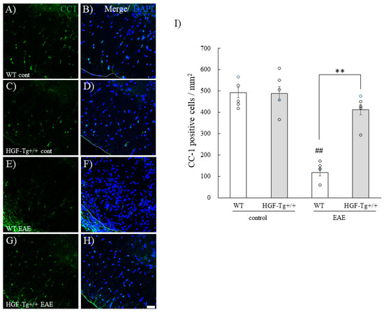 Oligodendroglial cell death was observed during EAE. The number of oligodendrocytes the EAE spinal cord was then examined by immunohistochemistry with anti-CC1 antibody (a marker of mature oligodendrocyte [21]). In the white matter of the lumbar spinal cord of naïve mice, immunohistochemistry exhibited that the number of oligodendrocytes was no different between WT mice (Figure 5A) and HGF-Tg+/+ mice (Figure 5C,I). While the number of CC1+ oligodendrocytes in the EAE lumbar spinal cord of WT mice was decreased (Figure 5E), HGF-Tg+/+ mice showed suppression of oligodendroglial cell death during EAE (Figure 5G,I).