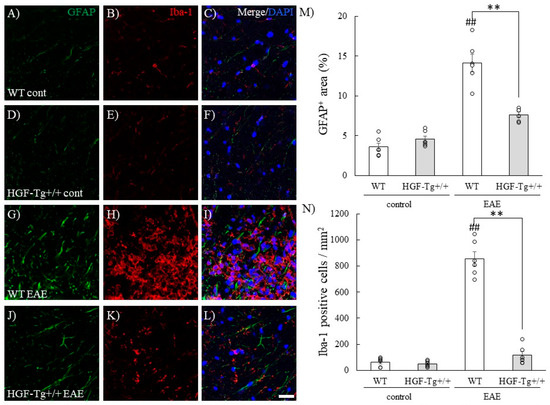 Astrocytes and microglia were also associated with the EAE pathogenesis [21,24]. Both astrocytic and microglial gliosis during EAE were then examined. The numbers of GFAP-positive astrocytes and Iba-1-positive microglia/macrophages in the white matter of the spinal cord were increased by EAE induction in WT mice (Figure 6A–C,G–I,M,N). By contrast, HGF suppressed astrocytic/microglial gliosis during EAE (Figure 5D–F,J–N). These observations suggest that HGF suppresses an increasing number of astrocytes and microglia in the white matter of the spinal cord during EAE.