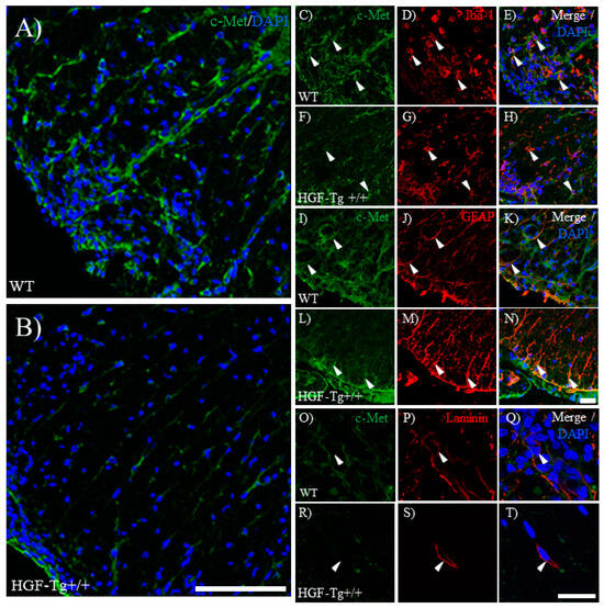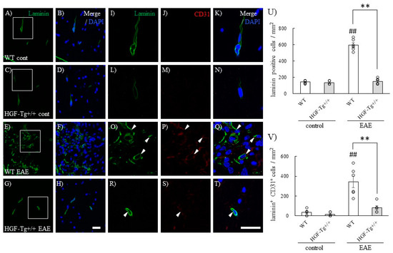 The expression of the HGF receptor c-Met was next examined in the EAE spinal cord. As shown in Figure 7, immunohistochemistry demonstrated that the higher expression of c-Met was observed in the EAE spinal cord of WT mice (Figure 7A) rather than HGF-Tg+/+ mice (Figure 7B). In addition, c-Met was expressed in Iba-1+ microglia/macrophages (Figure 7C–H), GFAP+ astrocytes (Figure 7I–N), and laminin+ vascular endothelial cells (Figure 7O–T) in the white matter of the spinal cord of both WT and HGF-Tg+/+ mice (Figure 7, arrowheads). Since vascular alterations such as angiogenesis are implicated in the pathogenesis of EAE [21,27], we further examined angiogenesis induced by EAE in these mice. CD31, which is expressed in the endothelial cells of blood vessels, can be used specifically as a representative marker for angiogenesis [6,21,27,28,29]. In the current study, CD31 is used as a marker for angiogenesis. Although there was no difference in laminin+ cells and laminin+CD31+ cells in naïve conditions between WT (Figure 8A,B,I–K) and HGF-Tg+/+ mice (Figure 8C,D,L–N), immunohistochemistry showed an increased number of laminin+ cells and angiogenic vessels (laminin+CD31+ cells) in the white matter of the EAE spinal cords of WT mice (Figure 8E,F,O–Q, arrowheads) but not in those of HGF-Tg+/+ mice (Figure 8G,H,R–T,U,V, arrowheads). These observations indicate that EAE-induced angiogenesis is associated with worsening EAE pathology and that HGF plays an important role in regulating EAE pathogenesis by suppressing EAE-induced angiogenesis.