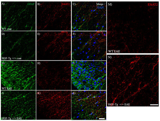 Glutamate toxicity is the major cause of the pathogenesis of EAE [21,30,31]. Previous studies have also demonstrated that HGF can reduce glutamate toxicity in murine animal disease models [12]. To assess the effect of HGF on glutamate toxicity, the distribution and expression of EAAT2, a glutamate transporter in astrocytes, was next explored at the peak of the EAE disease. In naïve conditions, EAAT2 was expressed in GFAP-positive astrocytes in the white matter of the lumbar spinal cord in both WT (Figure 9A–C) and HGF-Tg+/+ mice (Figure 9D–F). Although the decreased expression level of EAAT2 in astrocytes at peak disease of EAE was observed in WT mice (Figure 9G–I,M), HGF-Tg+/+ mice showed a sustained higher expression of EAAT2 at peak disease of EAE (Figure 9J–L,N). These results indicate that HGF reduces glutamate toxicity by sustainable expression of astrocytic EAAT2 to remove glutamate in the white matter of the EAE spinal cord.