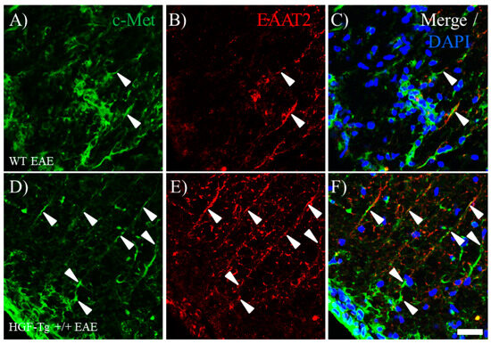 Co-expression of c-Met and EAAT2 in EAE. Frozen cross-sections of the lumbar spinal cords from either WT (A–C) or HGF-Tg+/+ mice (D–F) taken on day 20 post-immunization (peak disease) were stained with anti-c-Met antibody (green, A,D) and anti-EAAT2 antibody (red, B,E). Merge images are also shown with DAPI staining (blue, C,F). Arrows indicate c-Met and EAAT2 co-expressing astrocytes. Representative data are shown (n = 5). Scale bars: 20 μm (A–F).