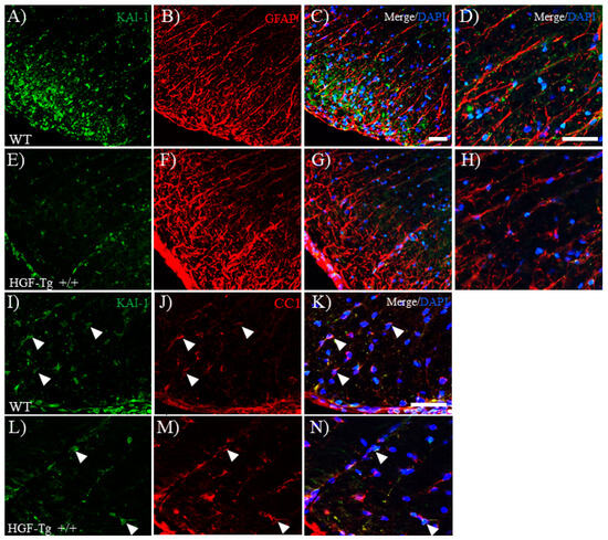 KAI-1 expression on astrocytes and oligodendrocytes in EAE. Frozen cross-sections of the lumbar spinal cords from either WT (A–D,I–K) or HGF-Tg+/+ mice (E–H,L–N) taken on day 20 post-immunization (peak disease) were stained with anti-KAI-1 antibody (green, A,E,I,L) and either anti-GFAP antibody (red, B,F) or anti-CC1 antibody (red, J,M). Merge images are also shown with DAPI staining (blue) (C,D,G–H,K,N). High-magnification images of C and G are shown in D and H, respectively. Arrows indicate KAI-1-expressing oligodendrocytes. Representative data are shown (n = 5). Scale bars: 50 μm (A–G) and 20 μm (D,H,I–N).