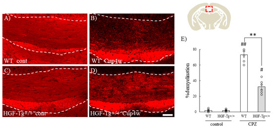Suppression of CPZ-induced demyelination in HGF-Tg+/+ mice. Frozen cross-sections of corpus callosum from either WT (A,B) or HGF-Tg+/+ mice (C,D) taken on either day 0 (A,C) or 4 weeks of 0.2% CPZ administration (B,D) were stained with fluoromyelin. The corpus callosum, corresponding to the red box in the brain illustration, is shown. The corpus callosum is represented by white dashed lines. Representative data are shown (n = 6). Scale bars: 100 μm. (E) Quantitative analysis of the numbers of % demyelination in the corpus callosum of naïve and EAE mice (n = 6). # p < 0.05, ## p < 0.01 (vs. naïve), ** p < 0.01 (vs. WT).