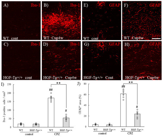 Cuprizone (CPZ) was purchased from Sigma-Aldrich, and the special chow containing 0.2% CPZ was synthesized (Oriental Yeast Co., Ltd., Chiba, Japan). Female HGF-Tg and WT mice (n = 10/treatment) at 8 weeks of age were provided the CPZ chow for 4 weeks [20,43].