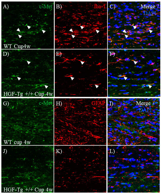 Expression of c-Met on astrocytes and microglia in CPZ-treated demyelination. Frozen cross-sections of corpus callosum from either WT (A–C,G–I) or HGF-Tg+/+ mice (D–F,J–L) taken on 4 weeks of 0.2% CPZ administration were stained with anti-c-Met antibody (A,D,G,H) and either anti-Iba-1 antibody (red, B,E) or anti-GFAP antibody (red, H,K). Merge images are also shown with DAPI staining (blue) (C,F,I,L). Arrows indicate c-Met-expressing Iba-1+ cells. Representative data are shown (n = 5). Scale bars: 20 μm.