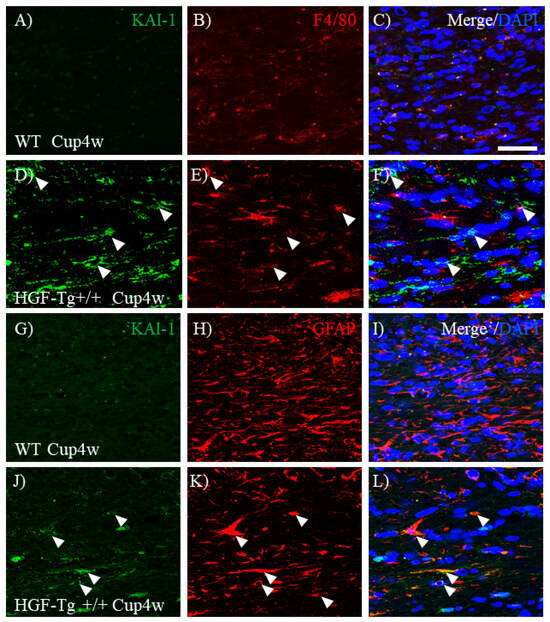 Expression of KAI-1 on astrocytes and microglia in CPZ-treated demyelination. Frozen cross-sections of corpus callosum from either WT (A–C,G–I) or HGF-Tg+/+ mice (D–F,J–L) taken on 4 weeks of 0.2% CPZ administration were stained with anti-KAI-1 antibody (A,D,G,H) and either anti-F4/80 antibody (red, B,E) or anti-GFAP antibody (red, H,K). Merge images are also shown with DAPI staining (blue) (C,F,I,L). Arrows indicate KAI-1-expressing GFAP+ cells. Representative data are shown (n = 5). Scale bars: 20 μm.