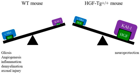 The results from the current study indicate that HGF provides significant neuroprotective benefits in experimental models of MS. HGF produced by neurons suppressed not only demyelination followed by axonal damage in EAE but also CPZ-induced demyelination, which is a completely different animal model. It suggests that neurons may have the ability to protect oligodendrocytes by producing neuroprotective factors such as HGF. In addition, the HGF/c-Met/KAI-1 signaling pathways in astrocytes and microglia played a critical role in neuroinflammation-mediated demyelination and axonal loss in MS.