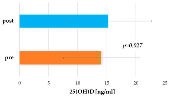 After 4 weeks of Atorvastatin treatment, 80% of patients still had 25(OH)D levels below 20 ng/mL. The mean 25(OH)D level was 15.52 ± 7.26 ng/mL for the entire study group, indicating an increase in 25(OH)D levels of 8.57% (p = 0.027) after Atorvastatin treatment (Figure 1).
