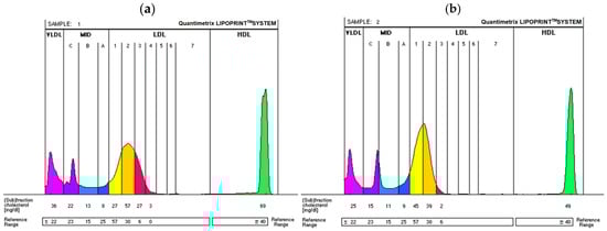 The Quantimetrix Lipoprint System LDL Subfractions Kit is a device designed to measure lipoprotein cholesterol (for lipoprotein fractions and subfractions from LDL to HDL) in fasting serum. The lipoprotein subfractions—VLDL, IDL-C, IDL-B, IDL-A, LDL1, LDL2 (large LDL), and LDL3-7 (small, dense LDL)—in the 34 patients were determined in serum using the Lipoprint® analyser (Quantimetrix Corp., Redondo Beach, CA, USA) with the Quantimetrix Lipoprint System LDL Subfractions Kit (Quantimetrix, Redondo Beach, CA, USA) following the manufacturer’s instructions. This method uses linear electrophoresis on a non-denaturing polyacrylamide gel to separate and quantify lipoprotein subfractions. Based on the size of the LDL subfraction particles, the Lipoprint® reports the LDL phenotype as non-atherogenic phenotype A (≥26.8 nm), intermediate phenotype AB (26.53–26.79 nm), and atherogenic phenotype B (≤26.5 nm). Individuals exhibiting lipoprotein profiles primarily consisting of larger, buoyant LDL1 and LDL2 subfractions are classified as Pattern A (phenotype A LDL, normal pattern LDL), while those with predominantly smaller, denser subfractions (LDL3–LDL7) are classified as Pattern B (phenotype B LDL, abnormal pattern LDL) [].
