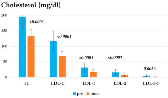 The detailed results of the electrophoretic studies are also presented in Figure 3. Atorvastatin treatment resulted in a reduction in less atherogenic, large LDL fractions (LDL1 and LDL2), as well as, most importantly, a decrease in the strongly atherogenic sdLDL (LDL3-LDL7).