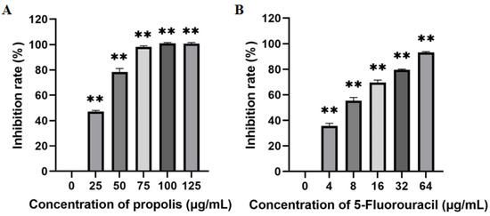 Inhibitory effects of ethanol-extracted propolis (A) and 5-fluorouracil (B) on the proliferation of A431 cells (there are three biological replicates, each with 6 wells; “**” means significantly different inhibition rates between the treatment group and control group).