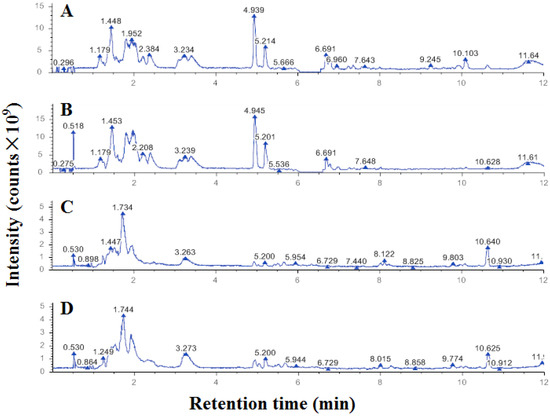 UHPLC‒MS/MS ion spectra of metabolites from A431 cells treated with ethanol-extracted propolis ((B) positive and (D) negative) and solvent ((A) positive and (C) negative).