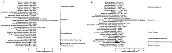 The proportions of Kyoto Encyclopedia of Genes and Genomes (KEGG) pathways enriched with differentially abundant metabolites in A431 cells treated with ethanol-extracted propolis account for the level 1 classification in positive ion mode (A) and negative ion mode (B).