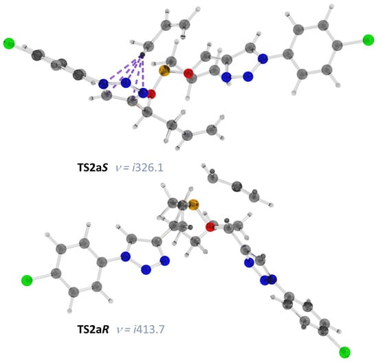 Optimized structures of transition states TS2a(S) and TS2a(R). Carbon: grey, hydrogen: white, oxygen: red, nitrogen: blue, chlorine: green, boron: yellow. Dashed violet lines illustrate strong CH…π interactions of the migrating allylic group with the triazolic ring in TS2a(S), which made it more stable than TS2a(R) for 5.4 kcal/mol.