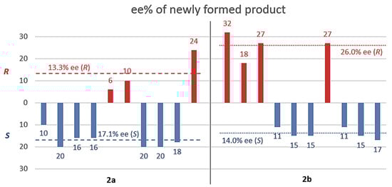 Actually, the formation of 2a and 2b with notable ee’s of both handedness was observed for the newly formed products. Although this result cannot be rationalized explicitly now, we considered the possibility of the conformational equilibria in 4a,b being involved. The computed differences in free energies of the transition states leading to R and S enantiomers are dependent on the particular conformation acquired by the molecule during reaction (and there are numerous possibilities). Activation barriers can be low even for the reaction leading to the formation of the opposite enantiomer of the newly formed product (for example TS2a’(R) in Table 2). Additionally, one cannot exclude the involvement of dynamic thermodynamic resolution in these reactions [].