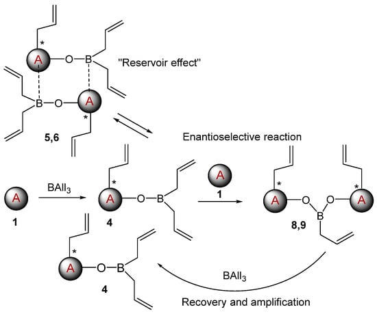 The chirality could be further amplified in the reaction of 8 with triallylborane, which has the capability of recovering two molecules of 4. Interestingly, this gives reasons to consider the whole process as autocatalytic, with 4 working as an autocatalyst.
