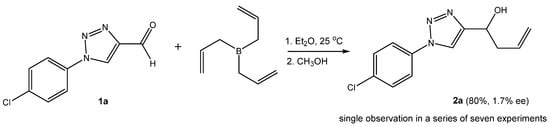In the course of our experiments studying non-catalyzed allylboration [], we detected once the formation of a non-racemic product 2a(S) (1.7% ee) from 1-(4-chlorophenyl)-1H-1,2,3-triazole-4-carboxaldehyde (1a) in a series of seven experiments; in another six cases racemic products were observed (Scheme 1). No optically active products were observed in the allylboration of a series of structurally similar aldehydes 1b–e (Scheme 2).