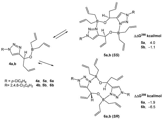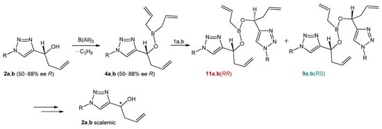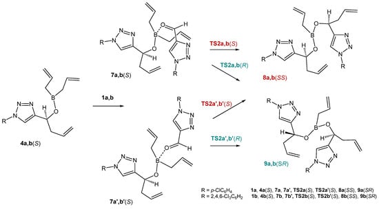 When inspecting Table 1, one can notice significant differences in effective Gibbs free activation energies of allylboration for aldehydes 1a–e. Apparently, electron withdrawing substituents in the 1,2,3-triazole ring increased the effective barrier of allylboration 2–3 times (compared to 1e). As both reagents were non-chiral, this reaction was capable of producing only a microscopic difference in concentrations of R and S products. Accordingly, this reaction would inevitably compete with any further enantioselective stage. We decided to restrict our further analysis, with aldehydes 1a,b exhibiting sufficiently high effective activation barriers in allylboration and having aryl substituents with different electronic properties. Importantly, the case of the spontaneous emergence of chirality was observed for 1a.