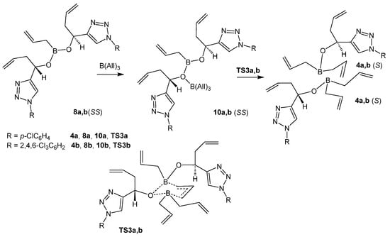 Further, we analyzed the possibility of the involvement of the second allylic group in the boronate esters 4 in allylboration. Aldehyde 1a coordinated to the S-enantiomer of boronate 4a(S) yielding adduct 7a(S) with two allylic groups symmetrically positioned at both sides of the coordinated carbonyl group. Nevertheless, the reactivity of these two groups can be significantly different. For example, TS2a(S) is 5.4 kcal/mol more stable than TS2a(R) (Scheme 4, Figure 3). Such a significant difference in the stabilities of transition states emerged due to the strong CH⋯π interactions between one of the protons of the allylic group involved in the migration process, which was possible only in TS2a(S) (Scheme 4). This finding demonstrates the effectiveness of the triazolic group as a stereoregulating group, even in relatively small molecules.