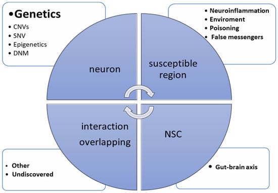 Chart presenting the most important pathways involved in ASD. Moreover, it presents overlapping and interaction the most common malfunctions observed in ASD. (CNVs—copy number variations; SNV—single-nucleotide variations; DNM—de novo mutation; NSC—neural stem cell).